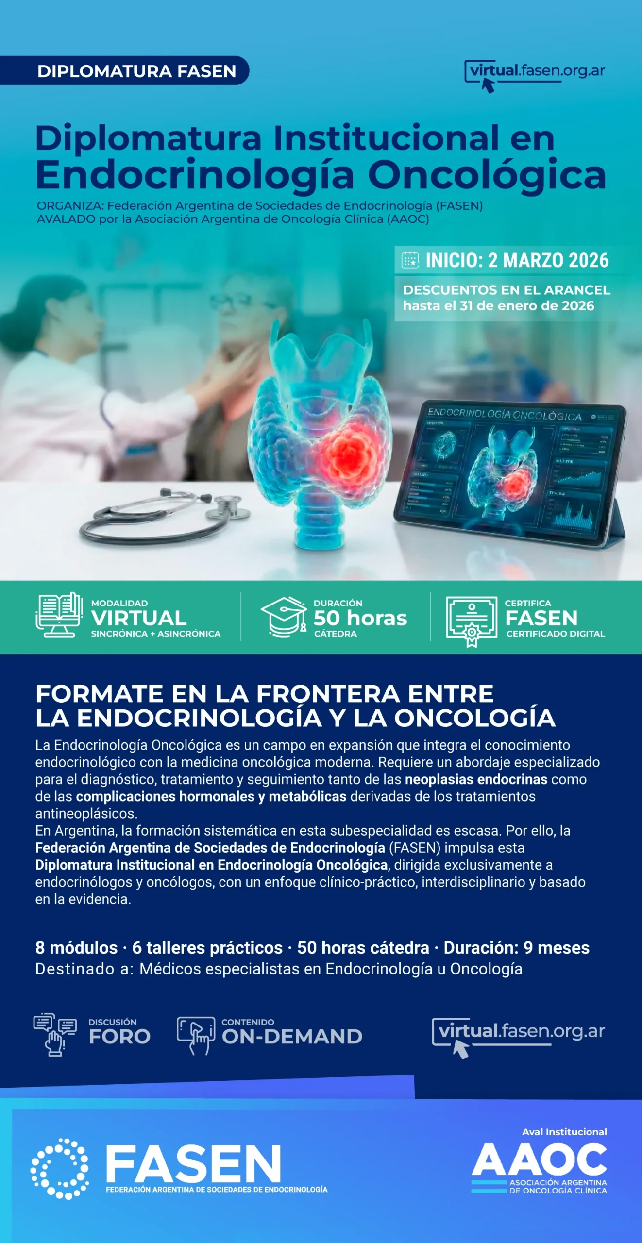 En Argentina, la formación sistemática en esta subespecialidad es escasa. Por ello, la Federación Argentina de Sociedades de Endocrinología (FASEN) impulsa esta Diplomatura Institucional en Endocrinología Oncológica, dirigida exclusivamente a endocrinólogos y oncólogos, con un enfoque clínico-práctico, interdisciplinario y basado en la evidencia.